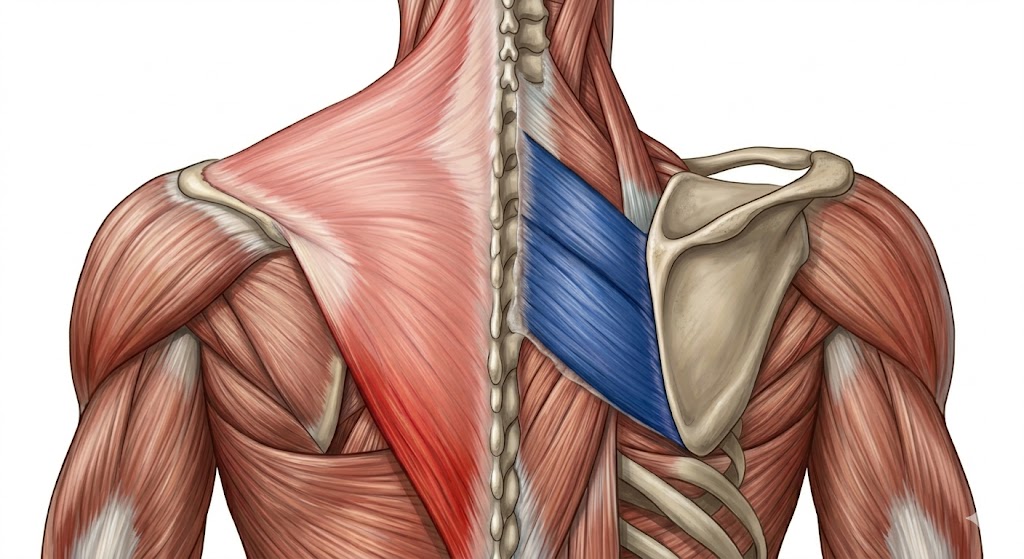 背中の菱形筋(りょうけいきん)や僧帽筋(そうぼうきん)が痛む理由は、実は単純。巻き肩によって肩が前に出ることで、これらの筋肉が常に後ろから引っ張られ、「伸びっぱなし」の状態で固まっているからなのです。